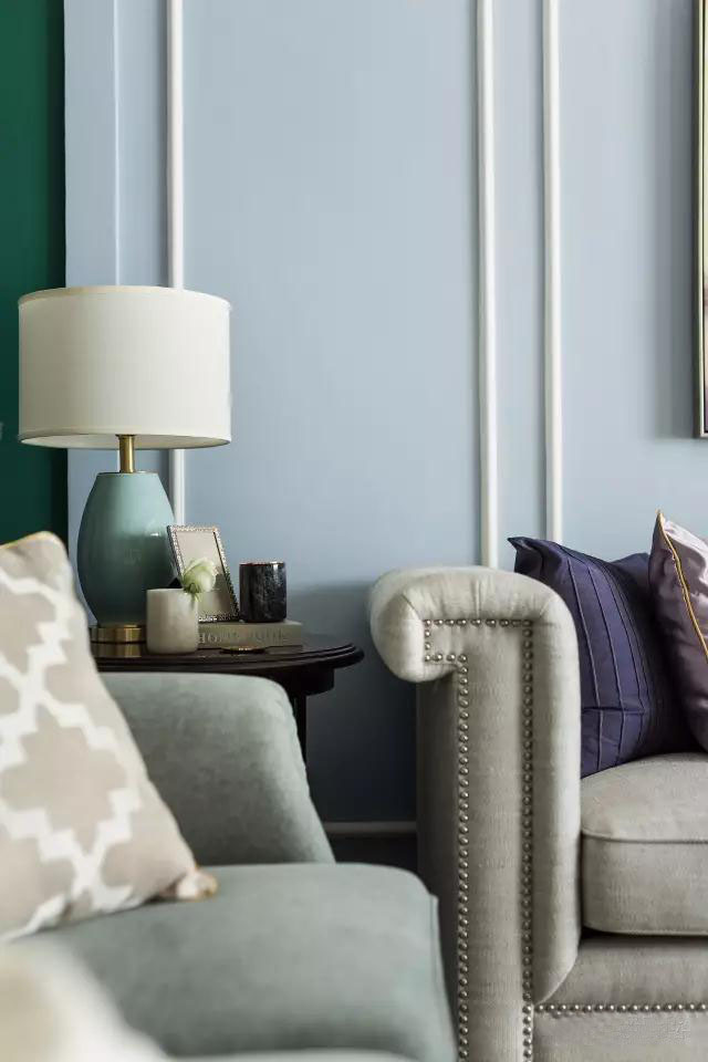 GIOVANNI乔瓦尼作为墙面的背景颜色,淡淡的优雅感觉仿若香氛一般弥漫在整个空间之中。偏紫色的深蓝色沙发,好像可以透过这些美景看到女主人公每日梳妆的模样。