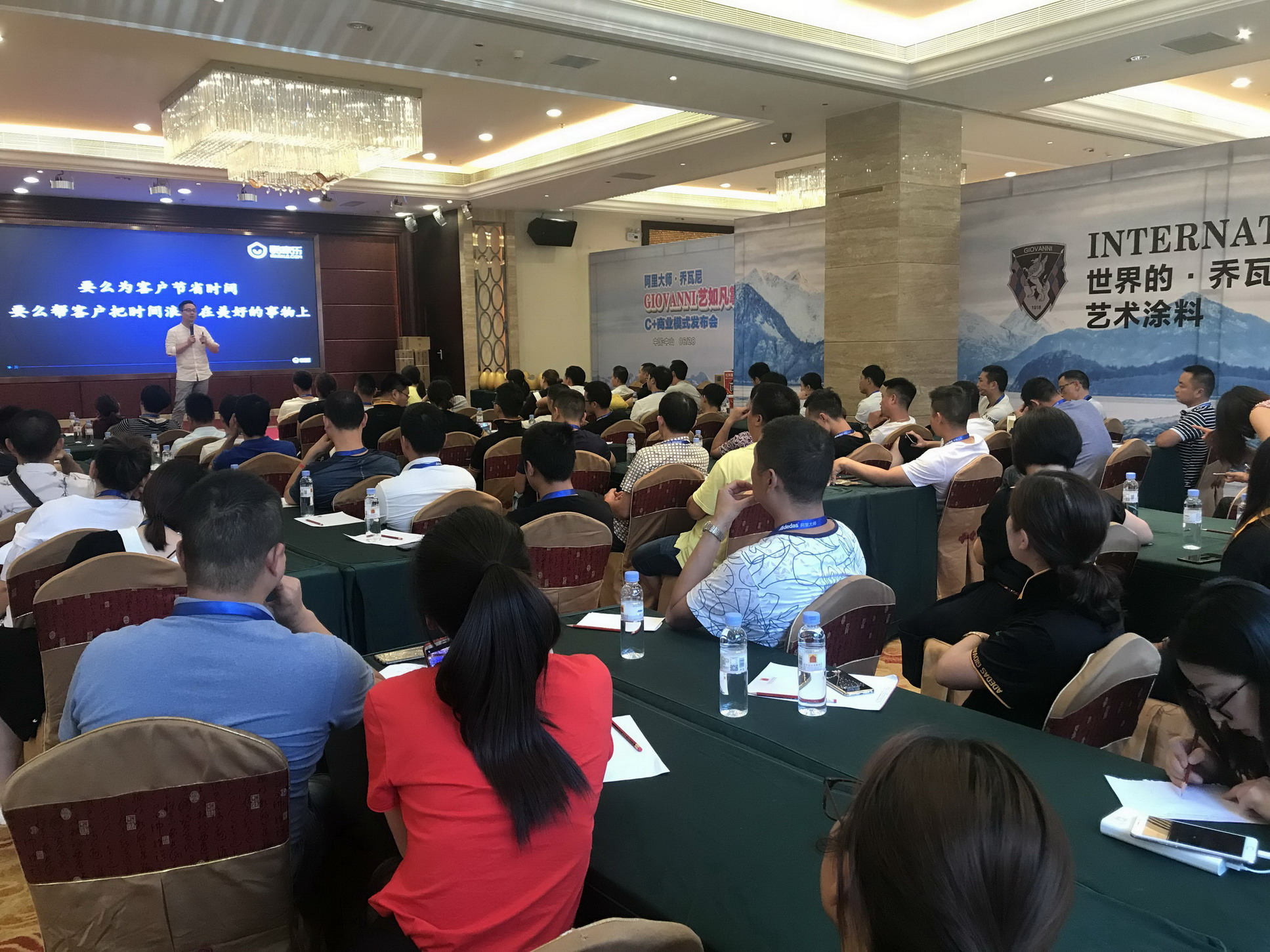 阿里大师集团营销总监李井锋先生上台讲解了GIOVANNI乔瓦尼的品牌历史,并介绍了GIOVANNI乔瓦尼艺术涂料下半年的营销模式。GIOVANNI乔瓦尼艺术涂料“健康、正向、可持续”的发展模式与深谋远虑的营销策略,让代理商们在现在涂料市场竞争已然演化为一场贴身肉搏战的情况下看到了GIOVANNI乔瓦尼艺术涂料的美好前景。